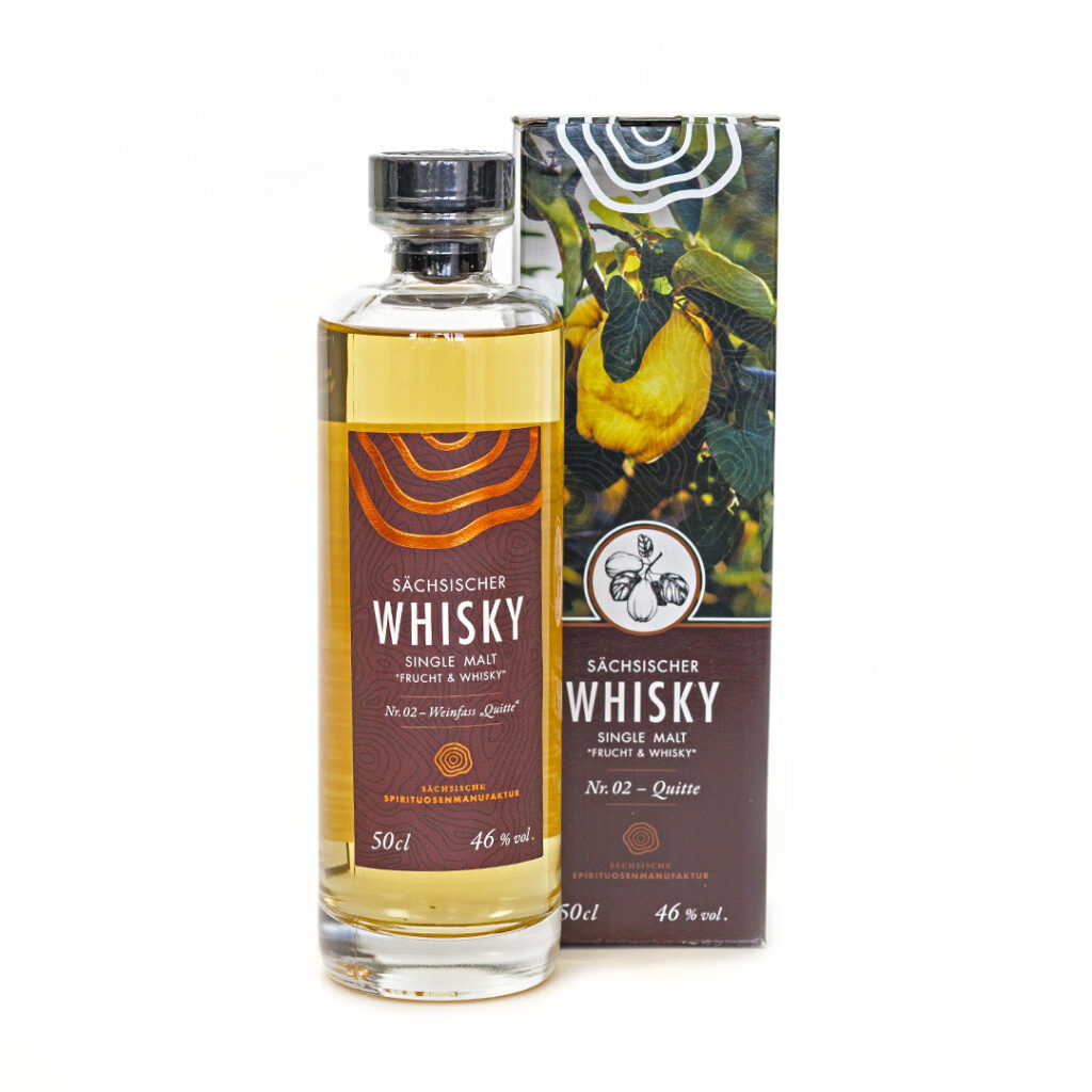 Einen weiteren feinen fruchtigen Whisky genießen Sie mit der Edition 2. Sächsischer Whisky gereift im Quittenweinfass. Im Glas strömt Ihnen der herbe fruchtig-frische Quittenduft entgegen gefolgt von Zitrusnoten. Der Geschmack ist vanillig-süß, fruchtig und herb.